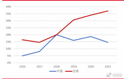 图:全球及中国跟踪支架渗透率变化(单位:%)