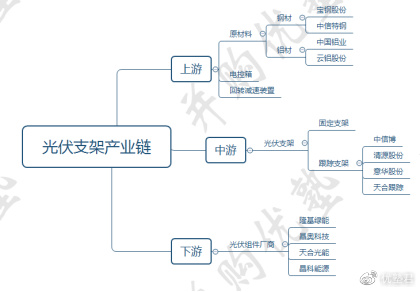 上游——主要是大宗金属材料加工、镀锌、机械及电子元器件行业。其中,以钢材和铝合金为代表的大宗金属材料的价格,对光伏支架企业原材料成本影响较大,占总成本32%以上。国内钢铝材公司有宝钢股份、中信特钢、中国铝业、云铝股份等。