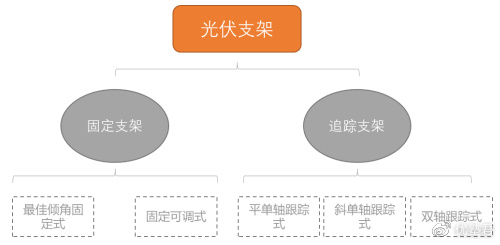 光伏支架以光伏阵列能否跟随太阳入射角度变化转动,分为固定支架和跟踪支架。其中: