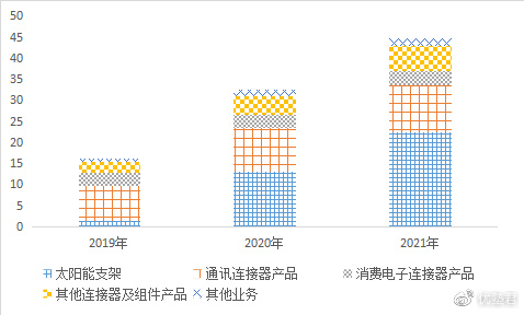 2021年,太阳能支架收入22.56亿元,占比50.26%;通讯连接器产品收入11.03亿元,占比24.57%;消费电子连接器产品收入3.44亿元,占比7.66%。