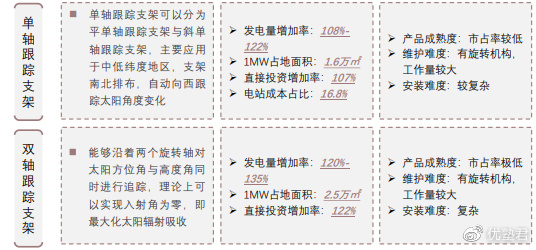 跟踪支架价值量高于固定支架,主要是跟踪支架包含回转减速装置、电控箱以及相匹配的智能控制系统。主要应用于集中式光伏装机,目前市场以单轴跟踪为主,双轴技术仍在发展阶段。